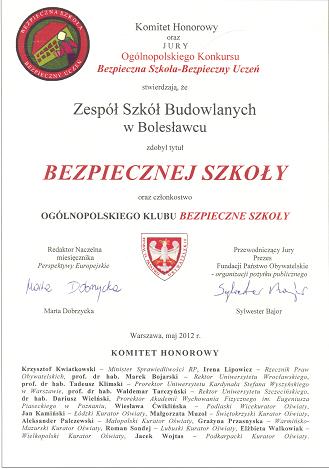 Dnia 29 czerwca 2012r. odbyło się uroczyste zakończenie roku szkolnego w Zespole Szkół Budowlanych w Bolesławcu. Pożegnanie licznej młodzieży szkoły zostało podzielone na trzy „tury”. O godzinie 9.00 odbyło się zakończenie klas Zasadniczej Szkoły Zawodowej, następnie o 9.50 i 10.30 klas technikum. Rozpoczęciem uroczystości był wspaniały występ uczniów klasy III G, który przygotowywała Pani mgr Sylwia Lipska, nauczycielka języka polskiego. Na zakończenie Pan Dyrektor szkoły Jacek Jurkiewicz, a także zastępca dyrektora, Pan Mirosław Sudół, pożegnali młodzież a także przestrzegli przed niebezpieczeństwami, które mogą zaskoczyć młodych ludzi na wakacjach. Rozdano dużo dyplomów oraz nagród, za reprezentowanie szkoły, wzorową frekwencję na zajęciach, praktykach oraz wysokie oceny- zasłużonej młodzieży.