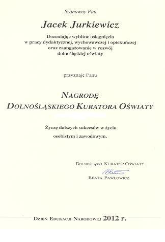 15 października w Sali Balowej Zamku Książ odbyło się uroczyste odznaczanie nauczycieli wyróżnionych przez dolnośląskiego kuratora oświaty. Wśród nagrodzonych był także pan Jacek Jurkiewicz, dyrektor naszej szkoły. Nagroda została przyznana jako dowód uznania za wybitne osiągnięcia w pracy dydaktycznej, wychowawczej i opiekuńczej, a także za zaangażowanie w rozwój dolnośląskiej oświaty.