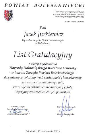 "Nagroda Dolnośląskiego Kuratora Oświaty dla Dyrektora Zespołu Szkół Budowlanych"
